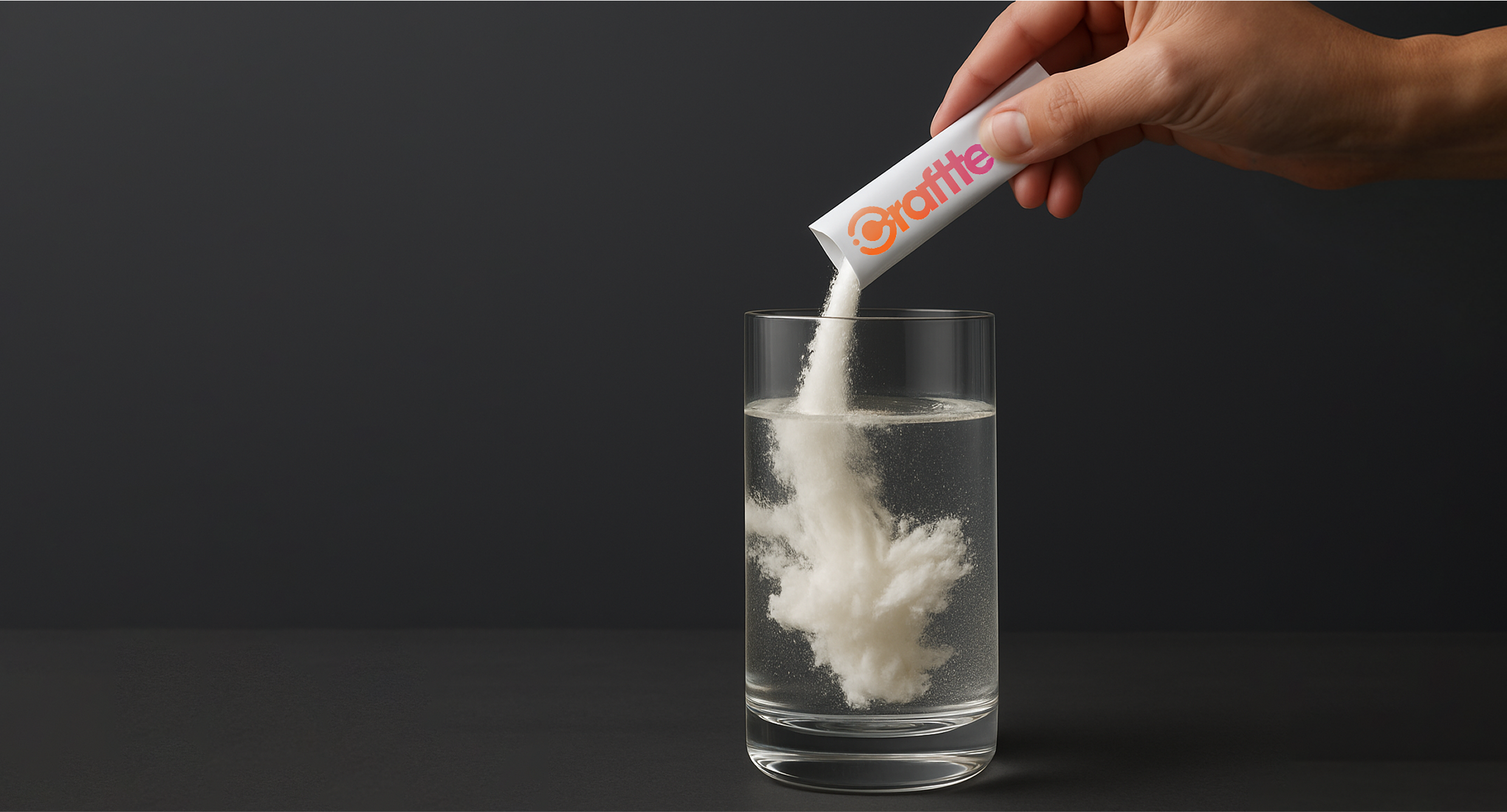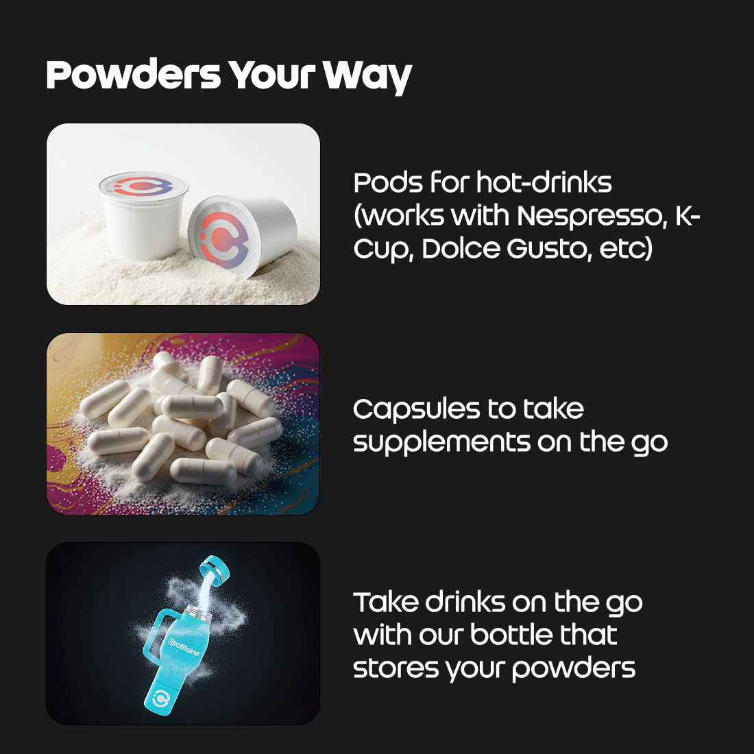 Add your powder to water, milk, or any beverage. It dissolves in seconds and works with any drink, giving you portable, zero-waste fuel whenever you need it.